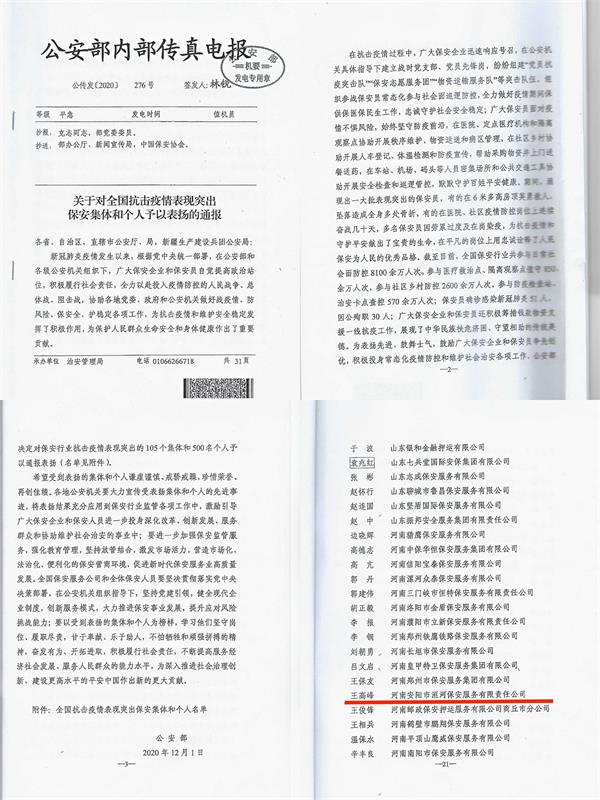 為表?yè)P(yáng)先進(jìn)、鼓舞士氣,鼓勵(lì)廣大保安企業(yè)和保安員爭(zhēng)先創(chuàng)優(yōu),積極投身常態(tài)化疫情防控和維護(hù)社會(huì)治安各項(xiàng)工作,公安部公傳發(fā)【2020】276號(hào)、河南省公安廳豫公治【2021】45號(hào)文件,通報(bào)表?yè)P(yáng)保安行業(yè)抗擊疫情表現(xiàn)突出集體和個(gè)人。其中安陽(yáng)市洹河保安服務(wù)有限責(zé)任公司榮獲“全省抗擊疫情表現(xiàn)突出集體”;公司黨委書(shū)記、董事長(zhǎng)、總經(jīng)理王高峰榮獲“全國(guó)抗擊疫情表現(xiàn)突出個(gè)人”榮譽(yù)稱號(hào)。