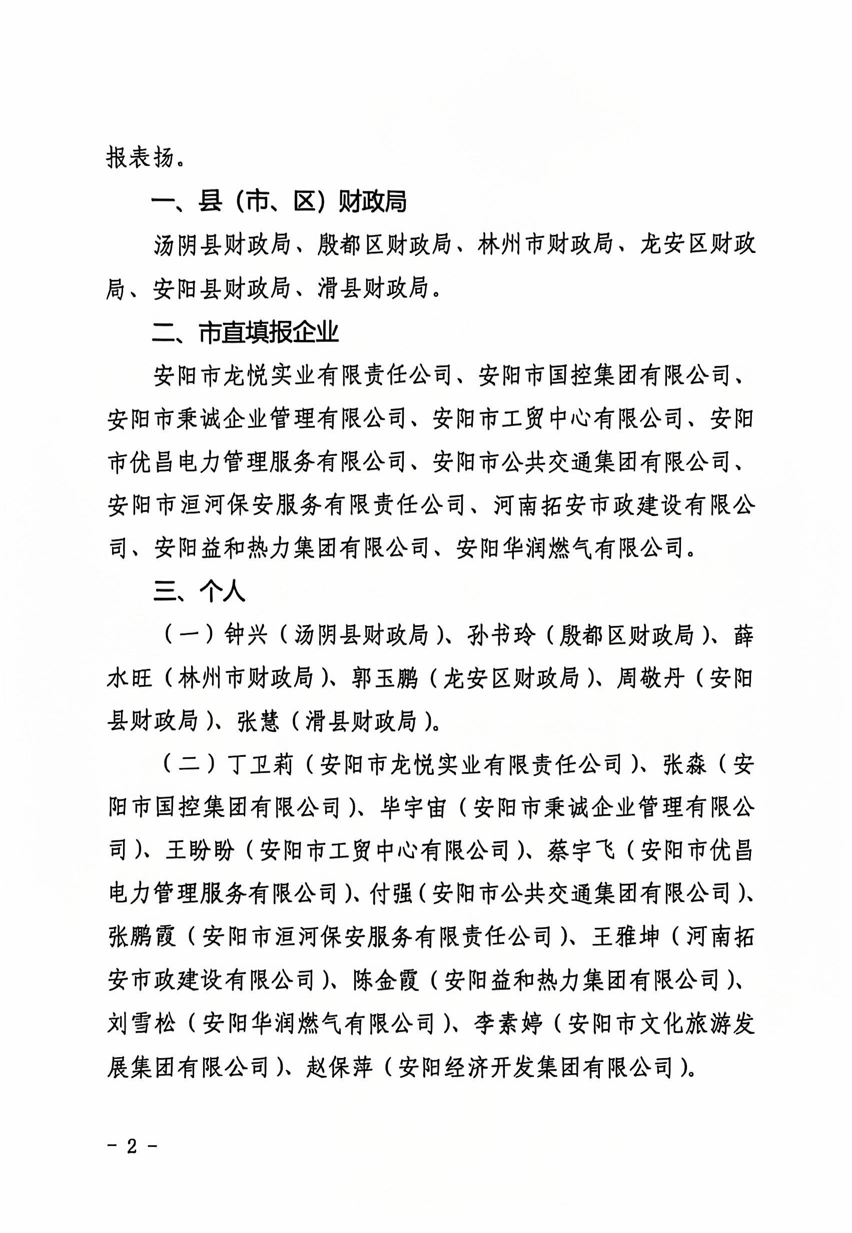 10月25日,安陽市財政局印發(fā)《關(guān)于2023年度企業(yè)經(jīng)濟效益月報工作的通報》(安財企〔2024〕5號),經(jīng)安陽市財政局綜合考評,洹河保安公司2023年度經(jīng)濟效益月報工作及財務(wù)部副主任張鵬霞同志,被通報表揚。