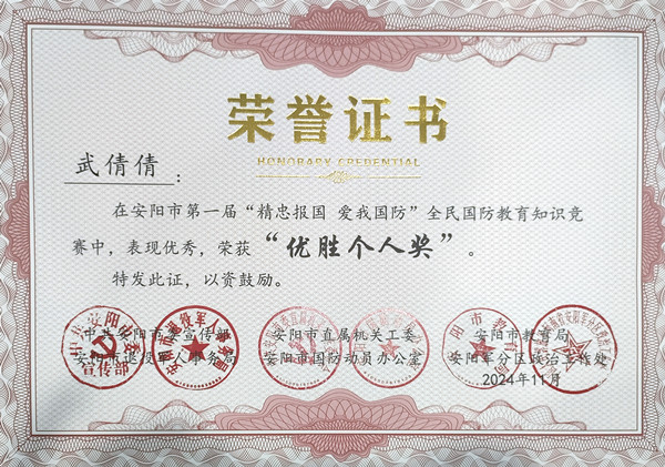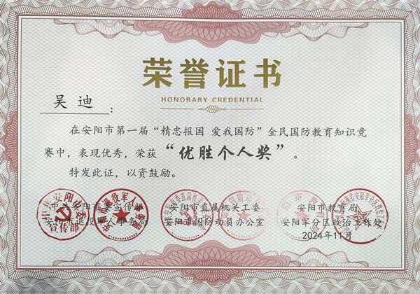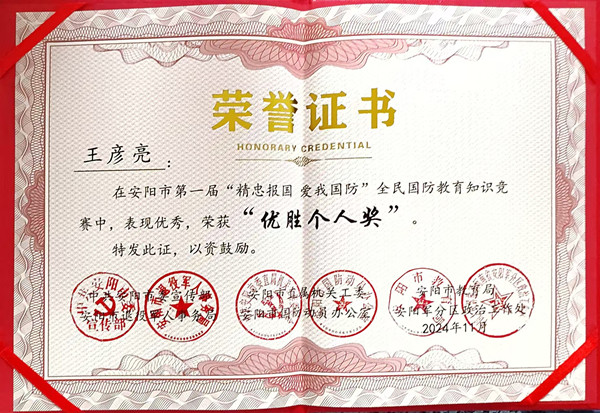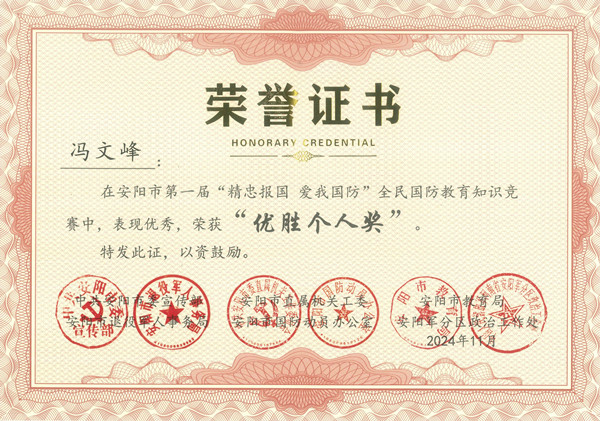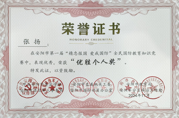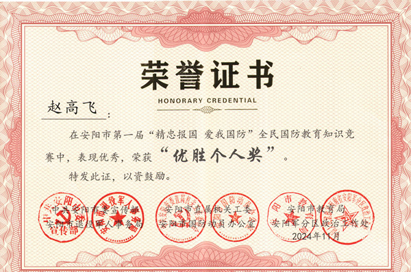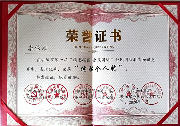 近日,安陽(yáng)市第一屆“精忠報(bào)國(guó) 愛(ài)我國(guó)防”全民國(guó)防教育知識(shí)競(jìng)賽圓滿落幕,公司馮文峰、李保順、王彥亮、趙高飛、張揚(yáng)、楊芹嬌、吳迪、武倩倩等8名同志榮獲“優(yōu)勝個(gè)人獎(jiǎng)”。