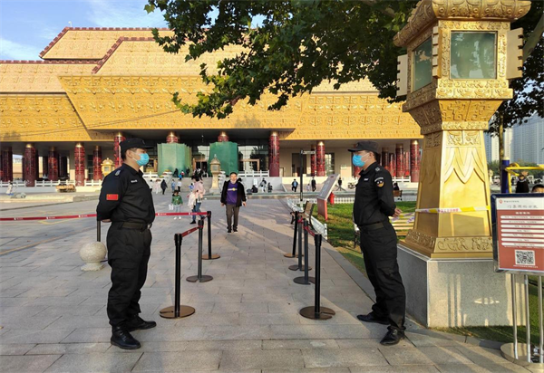 根據(jù)工作職責(zé),外圍隊(duì)員負(fù)責(zé)查驗(yàn)游客佩戴口罩、場所碼、48小時核酸檢測陰性報告、電子門票預(yù)約等。女子班隊(duì)員負(fù)責(zé)安檢,提醒游客有序掃碼掃票,并進(jìn)行危險物品檢查。各展廳隊(duì)員在崗在位,維護(hù)參觀秩序。大家不畏辛苦,堅(jiān)守崗位履職盡責(zé),國慶期間共接待游客約2萬人次,平均每日3000人次,圓滿完成各項(xiàng)安保任務(wù)。