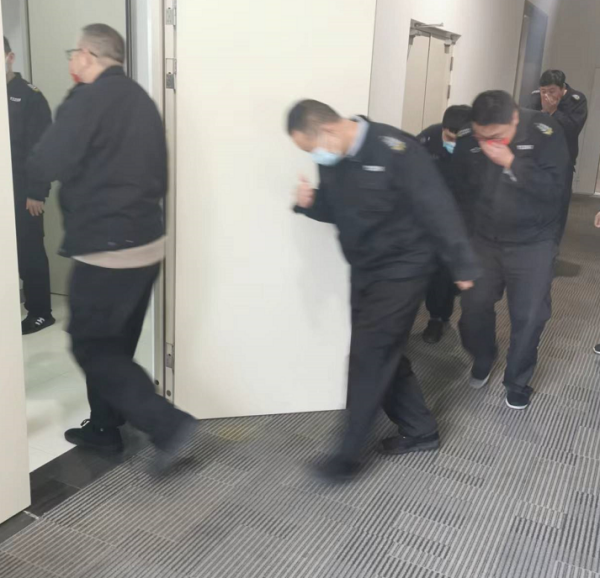 隨著一聲“開始”,大家“掩鼻、貓腰、溜墻根”有秩序的迅速走出房間,通過最近的安全通道逃生,到達安全區(qū)域。
