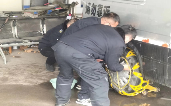 收車后,大隊長馮文峰帶領(lǐng)各個車組對押運車輛進(jìn)行全面檢查,查看防滑鏈?zhǔn)欠駬p壞、是否可以正常使用。同時,要求各個車組訓(xùn)練拆裝防滑鏈,以便遭遇大雪、結(jié)冰天氣可以熟練迅速地安裝。