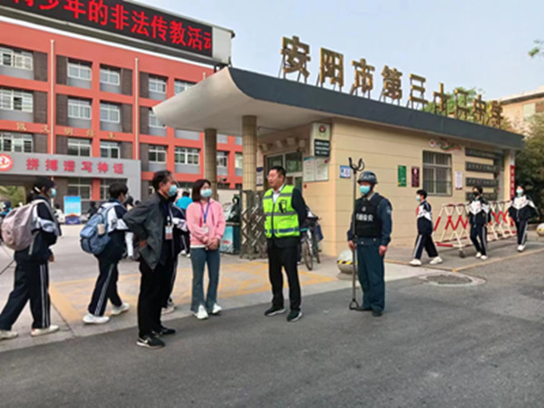 為進一步強化校園安全保衛(wèi)工作,人防分公司以打造平安安陽,守護校園安全,確保校園師生安全為目標,從2023年4月18日開始,人防分公司領導及各大隊中層干部每天早7點至8點半準時到各自分管的校園,疏導交通、維護秩序、保障師生進校安全暢通,協(xié)助校園保安維護學校高峰期安全,為全市區(qū)校園安全保駕護航。