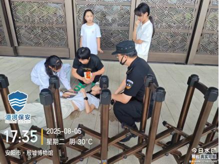 8月5日17時35分,殷墟博物館南門檢票區(qū),特保隊員李昊巡邏時,發(fā)現一名女游客突發(fā)暈厥。隨即上前穩(wěn)定游客身體姿態(tài),詢問同行的郭女士得知,暈倒者為其女兒,因高溫在等待檢票過程中突發(fā)身體不適繼而暈厥。