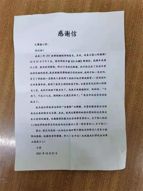 10 月21 日下午1點(diǎn),該校二年級(9)班黃煜嫻的家長王晶帶孩子來校參加《紅石榴》朗誦會?;琶χ?,下車時(shí)不慎把手機(jī)忘在了電動(dòng)車前面擋風(fēng)被的兜里,便匆匆進(jìn)了學(xué)校。因忙于幫助孩子們化妝,王晶根本想不起手機(jī)的事。后來她的手機(jī)一直在響,正在門口執(zhí)勤的保安員趙海利循聲找到手機(jī),便幫她保管了起來。待王晶忙完回來推車時(shí),趙海利主動(dòng)把手機(jī)交給了她。因?yàn)榇箝T外人行道過往的人很多,要不是這名保安給她把手機(jī)保管起來,肯定是找不回來了。王晶驚喜之余,表示要感謝他時(shí),趙海利善意提醒道:“不用了,下次小心點(diǎn),別再粗心大意忘東西了。”說完便忙他的去了。
