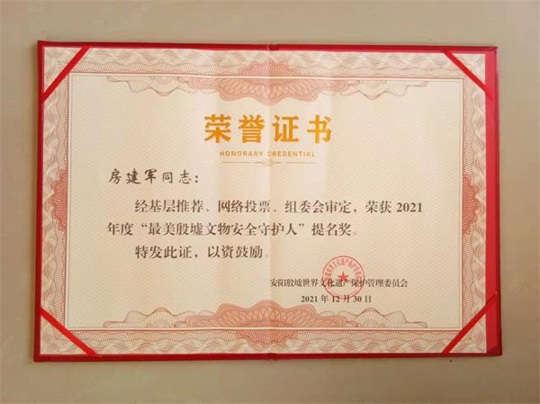 2021年12月31日上午,殷墟管委會在殷都區(qū)政府南三樓舉行“最美殷墟文物安全守護人”頒獎暨“殷墟”官網開通慶典儀式。人防二大隊駐龍安殷墟文物安全網格巡邏隊房建軍同志獲得“最美殷墟文物安全守護人”提名獎,受到龍安殷墟文物安全網格化管理工作簡報通報表揚,安陽殷墟世界文化遺產保護管理委員會頒發(fā)了榮譽證書。
