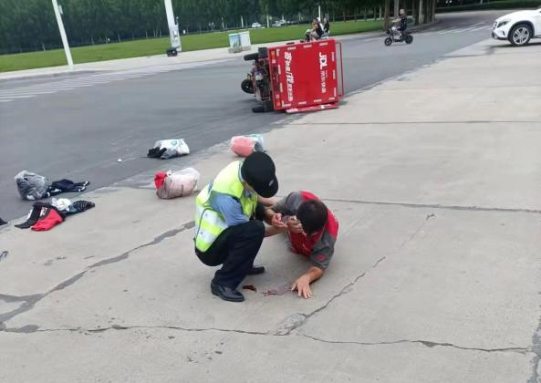 7月15日下午3點(diǎn),特保大隊(duì)四中隊(duì)隊(duì)員宋超、侯振國(guó)巡邏來(lái)到弦歌大道與平原路交叉口時(shí),發(fā)現(xiàn)該地發(fā)生一起交通事故,一輛出租車(chē)與三輪快遞車(chē)相撞。隊(duì)員們迅速停下查看情況,只見(jiàn)快遞哥額頭上流血不止,宋超迅速?gòu)目诖刑统鲂l(wèi)生紙幫快遞哥傷口止血。隨后,他們通知隊(duì)員司清瑄、郭東梁前來(lái)支援。
