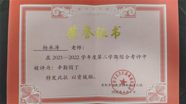 在新都城幼兒園授予該同志的榮譽證書上這樣寫道:楊承濤老師在2011--2022學年度第二學期綜合考評中被評為:辛勤園丁。在以往校園安保工作中,派駐的保安員受到客戶表彰者屢見不鮮,但不外乎“安全衛(wèi)士”“抗疫標兵”等褒獎,被以“老師”“園丁”冠名的卻不多見。這充分說明該幼兒園已經(jīng)把楊承濤當成內(nèi)部一名教職工看待,平時師生們都會以“楊老師”相稱。
