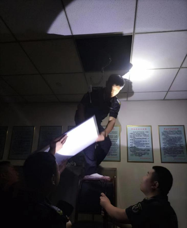 等候期間,監(jiān)控室隊(duì)員王文生去衛(wèi)生間,發(fā)現(xiàn)大家都在走廊站著,辦公室里漆黑一片。了解情況后,王文生默默地回到監(jiān)控室拿出自己常備的維修工具,上樓對吊頂燈進(jìn)行了拆卸,排查熄燈原因。盡管屋里悶熱無光,但王文生憑借多年的工作經(jīng)驗(yàn),僅用幾分鐘就完成了維修。在大家的等待中,突然傳來了王文生的聲音“送上電咱試一下?!?