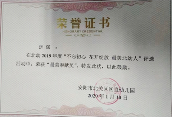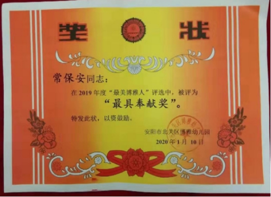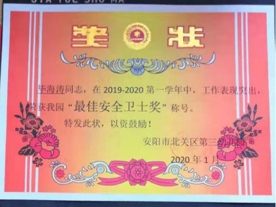獲獎隊員中,駐北關(guān)區(qū)區(qū)直幼兒園張強(qiáng)在2019年度“不忘初心 花開綻放 美麗北幼人”評選活動中,榮獲“美麗奉獻(xiàn)獎”;駐北關(guān)區(qū)博雅幼兒園常保安在“美麗博雅人”評選中,被評為“杰出奉獻(xiàn)獎”;駐北關(guān)區(qū)第三幼兒園畢海濤榮獲“杰出安全衛(wèi)士獎”稱號。自該大隊擔(dān)負(fù)北關(guān)區(qū)教育系統(tǒng)安全保衛(wèi)工作以來,駐各小學(xué)、幼兒園保安員夯實保安技能,開展應(yīng)急處置預(yù)案演練,認(rèn)真履行職責(zé),為創(chuàng)建平安校園做出了突出貢獻(xiàn)。