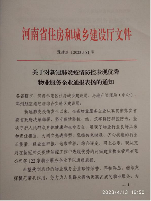 4月8日,河南省住房和城鄉(xiāng)建設(shè)廳通報表揚了全省新冠肺炎疫情防控工作表現(xiàn)優(yōu)秀的122家物業(yè)服務企業(yè),安陽鼎誠物業(yè)服務有限公司榜上有名。