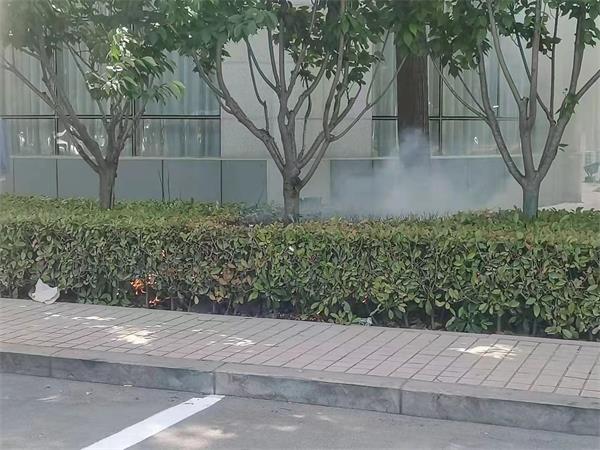 5月1日下午13點(diǎn)45分許,黨政大樓隊(duì)員苗沖沖巡邏到餐廳時(shí)發(fā)現(xiàn)綠化冒起濃煙,并冒起火苗,苗沖沖立即用對(duì)講報(bào)告班長(zhǎng)趙彬彬。趙彬彬在接到火情后,迅速操起兩個(gè)滅火器趕到現(xiàn)場(chǎng),和苗沖沖一起把火撲滅,避免了珍貴樹(shù)種被燒死和草坪被大面積燒毀。據(jù)分析,火情是由于抽煙者未掐滅而隨手丟棄煙頭引起的。