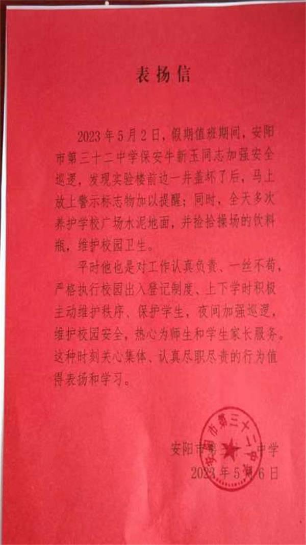 信中說道:5月2日,假期值班期間,牛新玉同志加強安全巡邏,發(fā)現(xiàn)學校實驗樓前邊一井蓋壞了后,馬上放上警示標志加以提醒;同時,全天多次養(yǎng)護學校廣場水泥地面,并撿拾操場的飲料瓶,維護校園衛(wèi)生。平時牛新玉同志對工作認真負責一絲不茍,嚴格執(zhí)行校園出入登記制度、上下學時積極主動維護秩序、保護學生,夜間加強巡邏,維護校園安全,熱心為師生和學生家長服務。這種時刻關心集體、認真履職盡責的行為值得表揚和學習。