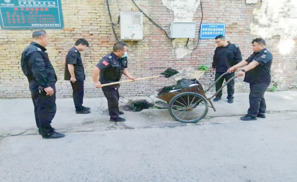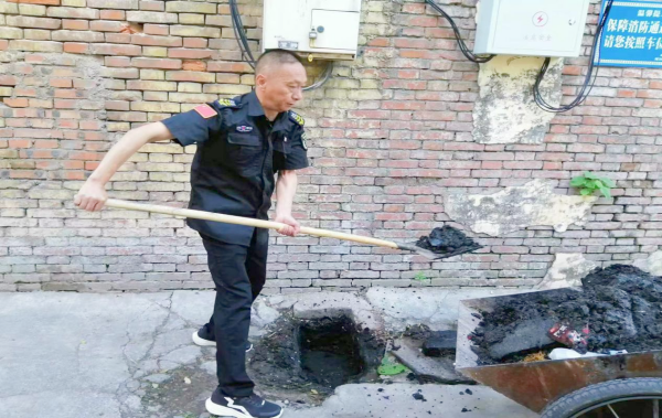 董偉得知情況后,立即組織隊員趕往現(xiàn)場進行查看,經排查發(fā)現(xiàn)污水外溢是由后院下水道沉淀池堵塞,造成營業(yè)廳污水難以排放。為徹底整治下水道堵塞這一“頑疾”,董偉安排水冶本地隊員從家里拿來鐵揪、手推車等工具,組織隊員對沉淀池進行徹底清理。當翻開沉淀池窨井蓋時,面對臭氣熏天的淤泥,隊員們沒有絲毫的退縮,頂著刺鼻的氣味,大家一起動手,將堵塞的淤泥、樹葉、生活垃圾等集中用推車清運拉走。下水道疏通后,隊員又提水把周圍污染的路面清洗干凈。下水道通了,路面也干凈了,大家的心情也舒暢了。