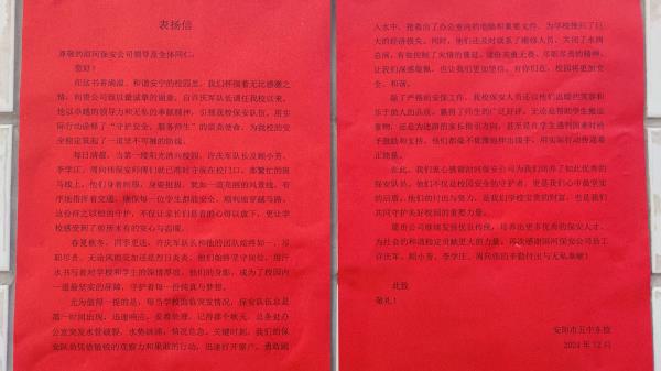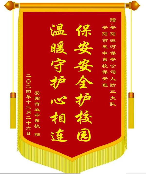 12月27日上午10時(shí)許,安陽(yáng)市五中東校有關(guān)領(lǐng)導(dǎo)專程將一面寫有“保安安全護(hù)校園 溫暖守護(hù)心相連”的錦旗和一紙表?yè)P(yáng)信送到公司,感謝公司人防三大隊(duì)派駐學(xué)校保安班一直以來對(duì)維護(hù)校園平安所作出的辛勤努力和付出,營(yíng)造了安全、有序、文明、和諧的環(huán)境,為構(gòu)筑平安和諧校園作出了重要貢獻(xiàn)。