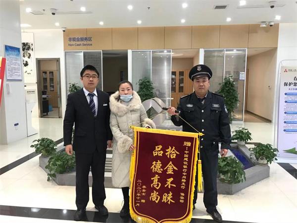 12月2日上午,李女士給中國建行中州路支行送來一面錦旗,激動地對行長說?!疤兄x你們了,如果不是建行保安大哥品德高尚,拾金不昧,我的損失就大了。”