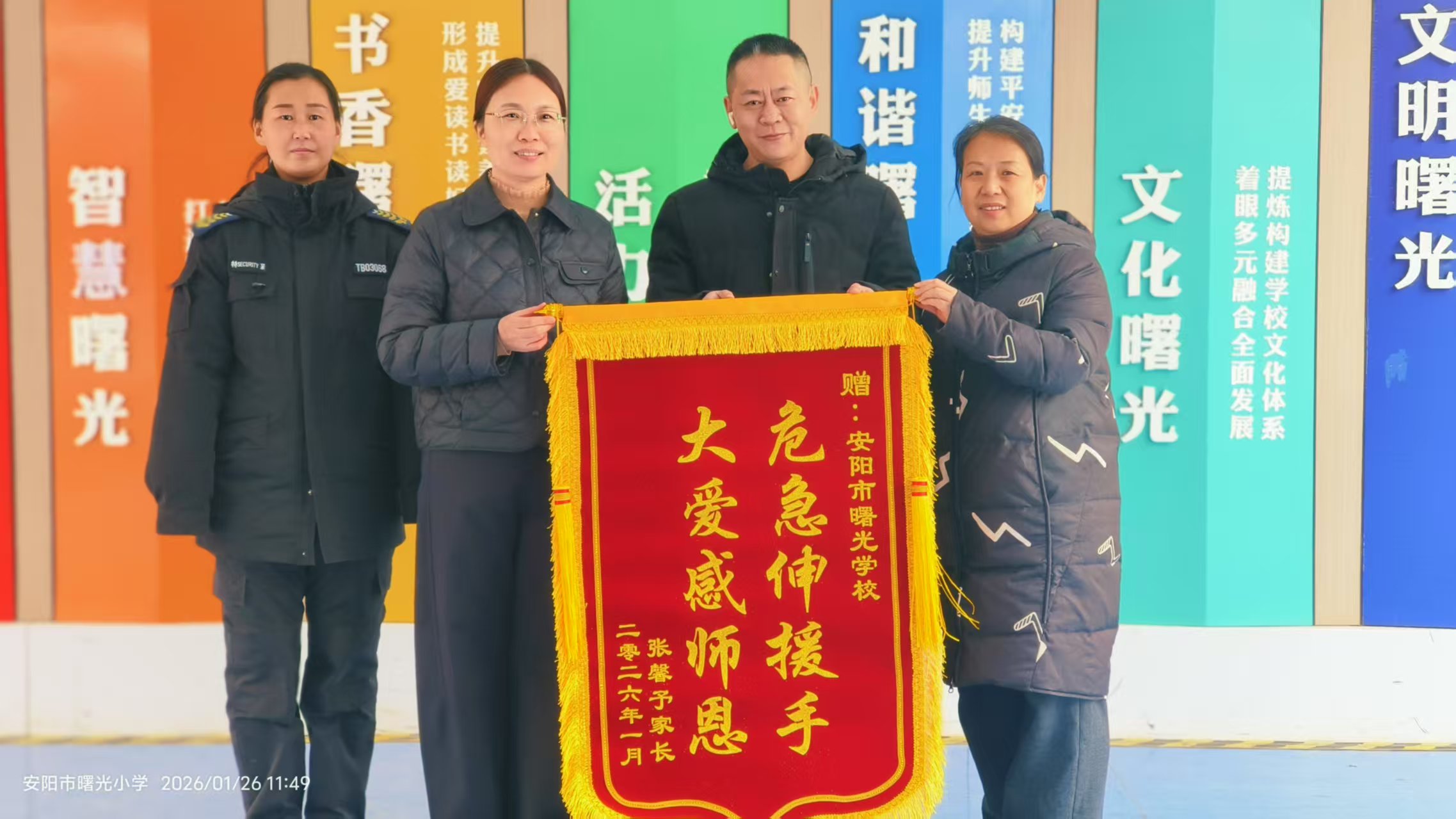 1月26日中午,一面滿載感激的錦旗被送至安陽(yáng)市曙光學(xué)校,老人家屬緊緊握住校領(lǐng)導(dǎo)的手連連致謝,感謝學(xué)校師生及人防五大隊(duì)駐校保安師娟的緊急施救,為老人挽回生命。這份謝意,源于1月23日中午校門口一場(chǎng)與死神賽跑的暖心救援。