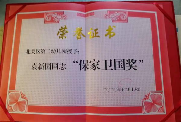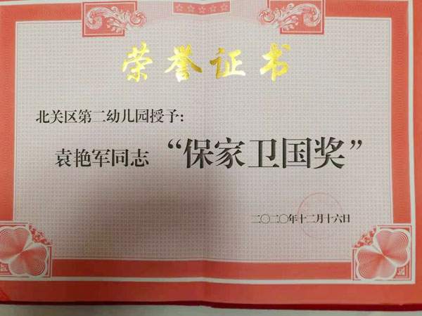 在北關(guān)區(qū)第二幼兒園園慶暨2020年表彰會上,兩名同志被園方授予“保家衛(wèi)國”榮譽稱號。二人表示,在新的一年里,一定不辜負(fù)領(lǐng)導(dǎo)的厚愛與期望,不忘宗旨使命,認(rèn)真履行職責(zé),為構(gòu)建平安幼兒園和抗擊疫情貢獻(xiàn)自己的力量。