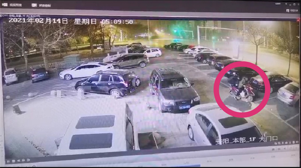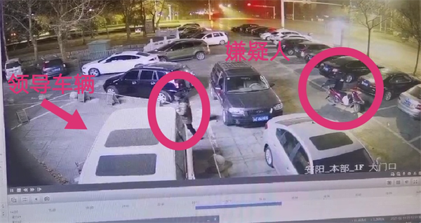 圖為發(fā)現(xiàn)可疑人員,一人圍繞銀行領(lǐng)導(dǎo)車(chē)輛查看,一人騎摩托車(chē)放風(fēng)(視頻截圖)