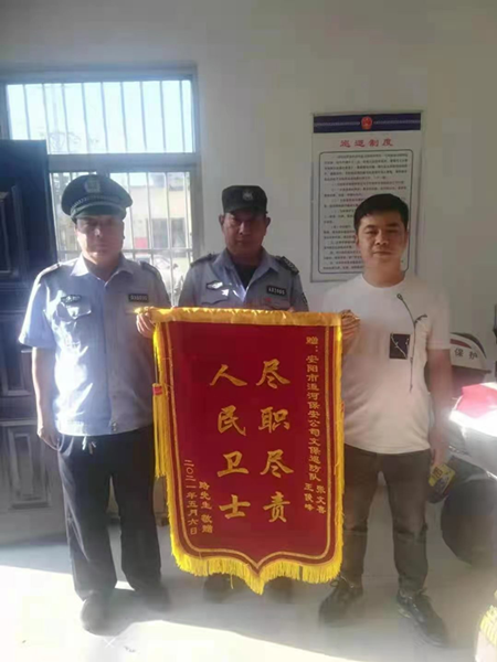 5月17日下午,安陽縣都里鄉(xiāng)好井村村民路鵬手持寫著“人民衛(wèi)士 盡職盡責(zé)”的錦旗趕到殷都區(qū)文廣新局文保巡防班,感謝巡防班班長王俊峰和隊(duì)員張文喜無私幫助其找回錢包的行為。