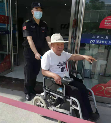 “大爺,您有什么事?需要我們幫忙嗎?”2021年5月24日下午,人防一大隊(duì)駐派浦發(fā)銀行鐵西分行保安員崔有榮、景建水正在執(zhí)勤,他們看到營(yíng)業(yè)廳外有一名坐輪椅老大爺停留在那里許久,于是馬上向前問(wèn)情況。