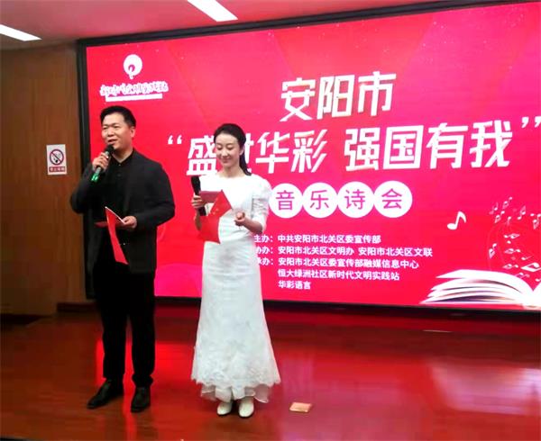 2021年10月17日下午,安陽市“盛世華彩 強(qiáng)國有我”音樂詩會(huì)在恒大綠洲社區(qū)新時(shí)代文明實(shí)踐站二樓宣講中心隆重舉行。安陽市總工會(huì)宣教部部長、市職工作家協(xié)會(huì)主席、市作家協(xié)會(huì)副主席、市文聯(lián)兼職副主席張艾敏觀看表演。公司培訓(xùn)中心王曉丹同臺(tái)獻(xiàn)藝。