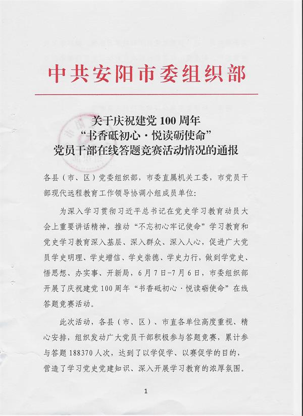 2021年6月7日——7月6日,按照中共安陽(yáng)市委組織部《關(guān)于開(kāi)展慶祝建黨100周年“書(shū)香砥初心·悅讀礪使命”黨員干部在線答題競(jìng)賽活動(dòng)的通知》要求,公司各黨支部積極組織黨員、預(yù)備黨員、入黨積極分子關(guān)注“安陽(yáng)黨建”微信公眾號(hào),踴躍參與線上答題活動(dòng)。