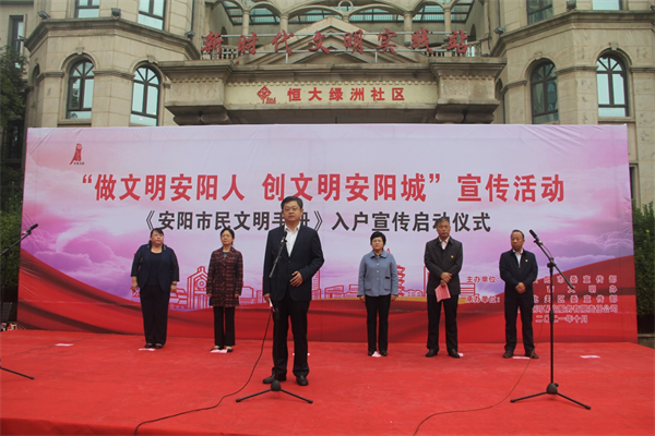 10月9日上午,由公司承辦的,安陽(yáng)“做文明安陽(yáng)人 創(chuàng)文明安陽(yáng)城”宣傳活動(dòng)暨《安陽(yáng)市民文明手冊(cè)》入戶宣傳啟動(dòng)儀式,在恒大綠洲新時(shí)代文明實(shí)踐站舉行。市委常委、宣傳部部長(zhǎng)、副市長(zhǎng)薛崇林,市人大常委會(huì)副主任張玲,市政協(xié)副主席李志弘,市委宣傳部副部長(zhǎng)、市文明辦主任車(chē)俊朝,北關(guān)區(qū)委副書(shū)記、區(qū)長(zhǎng)路錄平,北關(guān)區(qū)委常委、宣傳部長(zhǎng)、副區(qū)長(zhǎng)王洪忠,各級(jí)文明單位代表、社區(qū)代表、北關(guān)區(qū)志愿者代表,群眾代表參加儀式,儀式由車(chē)俊朝主持。公司黨委委員、副總經(jīng)理魏東帶領(lǐng)28名志愿者參加此次活動(dòng)。