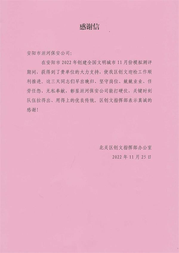 此次,志愿者們在服務(wù)中增強(qiáng)了社會(huì)責(zé)任感,以實(shí)際行動(dòng)圓滿完成了我市文明城市創(chuàng)建任務(wù),同時(shí)北關(guān)區(qū)創(chuàng)文指揮部發(fā)來表揚(yáng)信,表揚(yáng)公司在安陽市創(chuàng)文模擬測評(píng)期間做出的貢獻(xiàn)。彰顯了洹河保安公司能打硬仗,關(guān)鍵時(shí)刻隊(duì)伍拉得出、用得上的優(yōu)良傳統(tǒng),展示了洹河保安公司作為新創(chuàng)省級(jí)文明單位的責(zé)任擔(dān)當(dāng)和奉獻(xiàn)精神。