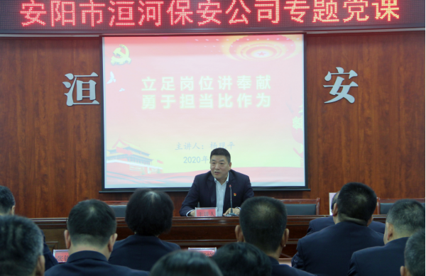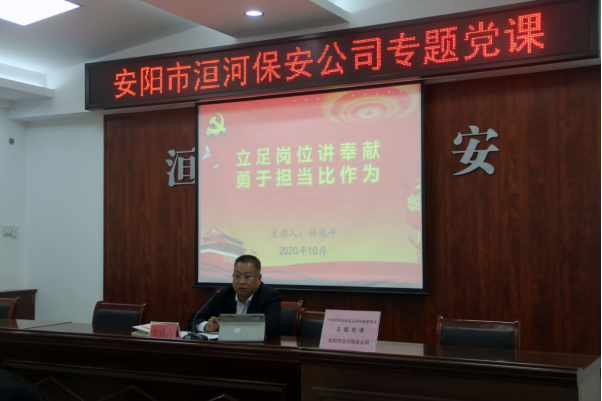 為進(jìn)一步提升黨員干部的黨性修養(yǎng)與政治素質(zhì),激勵(lì)以追求******、只爭朝夕的精神,擔(dān)當(dāng)作為、勇于奉獻(xiàn),努力建設(shè)新時(shí)代******保安隊(duì)伍。2020年10月30日下午4時(shí),在南二樓會(huì)議室,公司黨委組織召開了《立足崗位講奉獻(xiàn)、勇于擔(dān)當(dāng)比作為》專題黨課,黨課由第四黨支部書記楊現(xiàn)平為大家講授。公司黨委書記王高峰,黨委副書記張錫***,黨委委員高代獻(xiàn)、魏東、楊克忠,總經(jīng)理助理以及各黨支部書記、副書記、入黨積極分子代表40余人聆聽了黨課。黨課由張錫***同志主持。