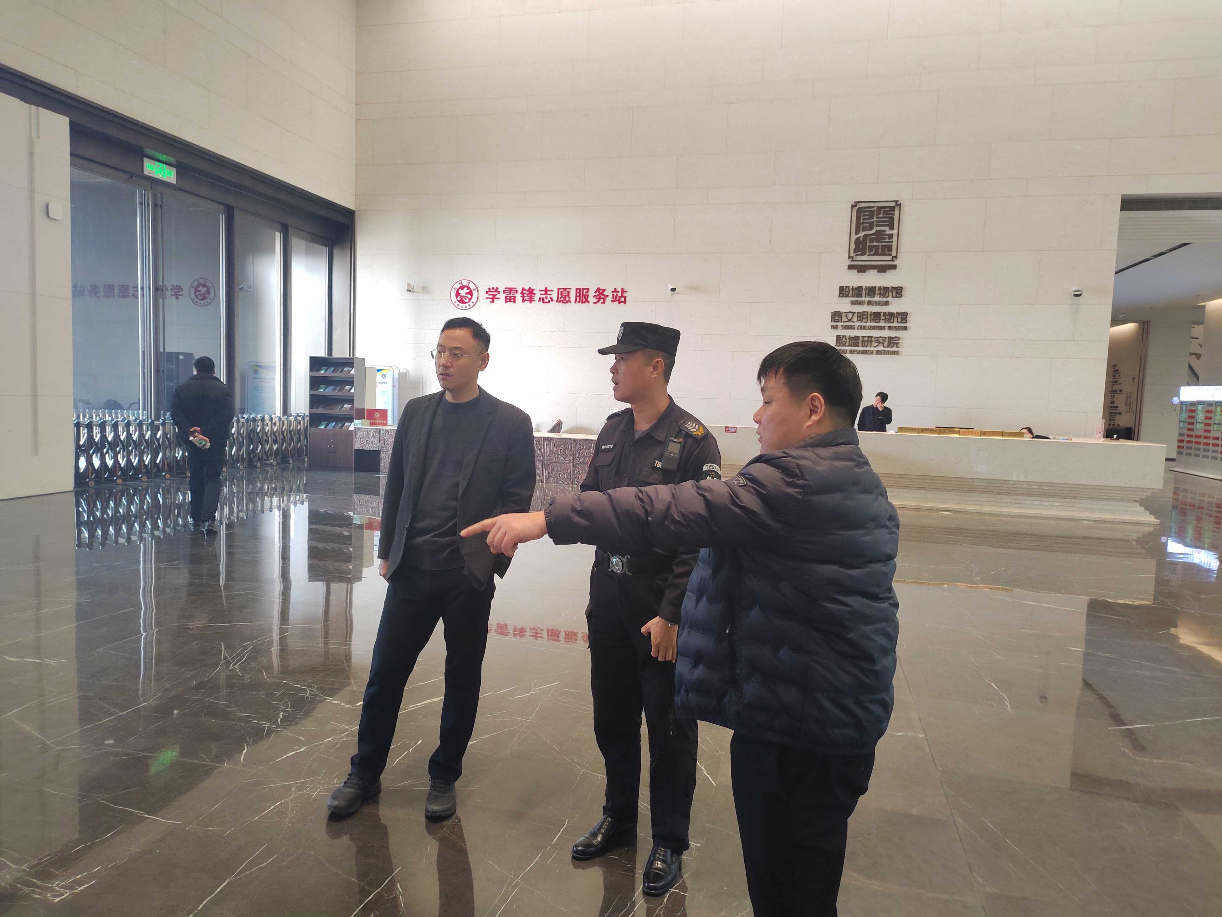 在大邑商博物館,鷹翔保安公司同仁實地考察公司派駐該博物館的安保工作,詳細了解安防系統(tǒng)的布局與運行情況,包括監(jiān)控設備的覆蓋范圍、報警系統(tǒng)的靈敏度以及與場館工作人員的聯(lián)動機制。同時,還觀摩了安保人員的日常巡邏,對公司的管理模式和細致服務給予高度評價。