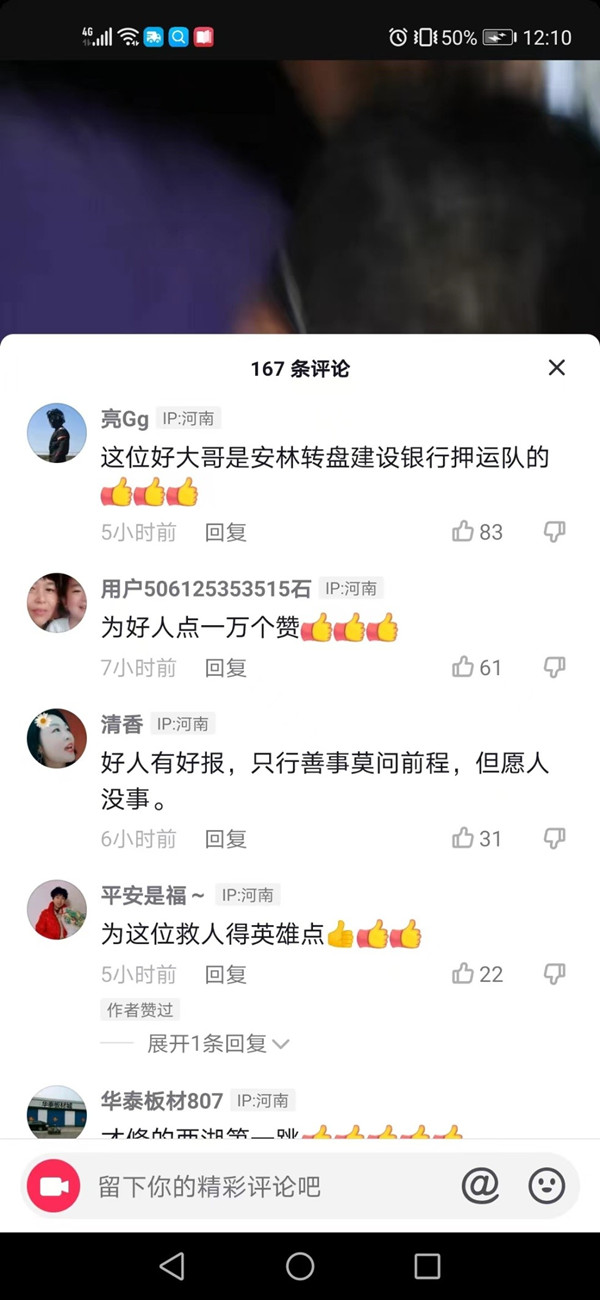 6月6日晚10時30分左右,韓海根、劉玉峰、張彩***、徐現(xiàn)強等四人下班后前往林州龍湖散步遛彎。當行至涼亭下面時,他們聽見“撲通”的落水聲,韓海根隱約看到附近的一位紅衣女子跳下了龍湖,他們借著夜色發(fā)現(xiàn)該女子在水里掙扎,此時,韓海根、劉玉峰、張彩***、徐現(xiàn)強四人迅速趕到落水點查看情況,旁邊已經(jīng)有路人在圍觀,但卻沒人下去營救,此時,隊員徐現(xiàn)強立即跳下去前去營救,韓海根、劉玉峰、張彩***打開手機電源為其進行照明指揮,經(jīng)過大家的努力,成功將落水女子救了上來。此時有路人已經(jīng)撥打了120和報警電話,救護車趕到后,四人合力又將落水女子抬上了救護車,路邊的群眾紛紛為其四人的行為點贊,并被路邊群眾拍攝視頻上傳到了抖音上,贊揚他們弘揚了社會正氣,傳遞了社會正能量,為四人的挺身而出和俠義之舉點贊。