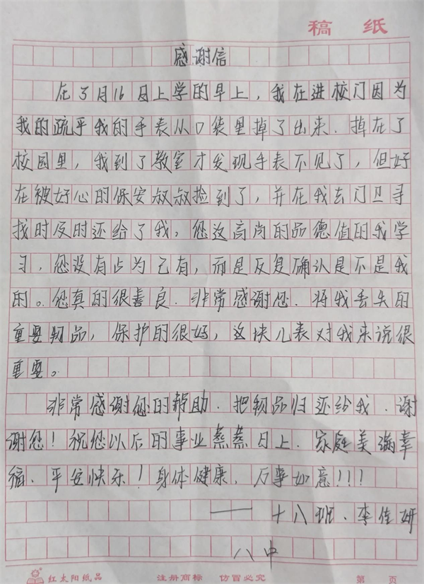 3月16日,市八中一名女學(xué)生來到學(xué)校門崗,將一紙感謝信送到人防三大隊派駐該校保安班中隊長楊海順手中,感謝楊海順撿到她遺失的電話手表。