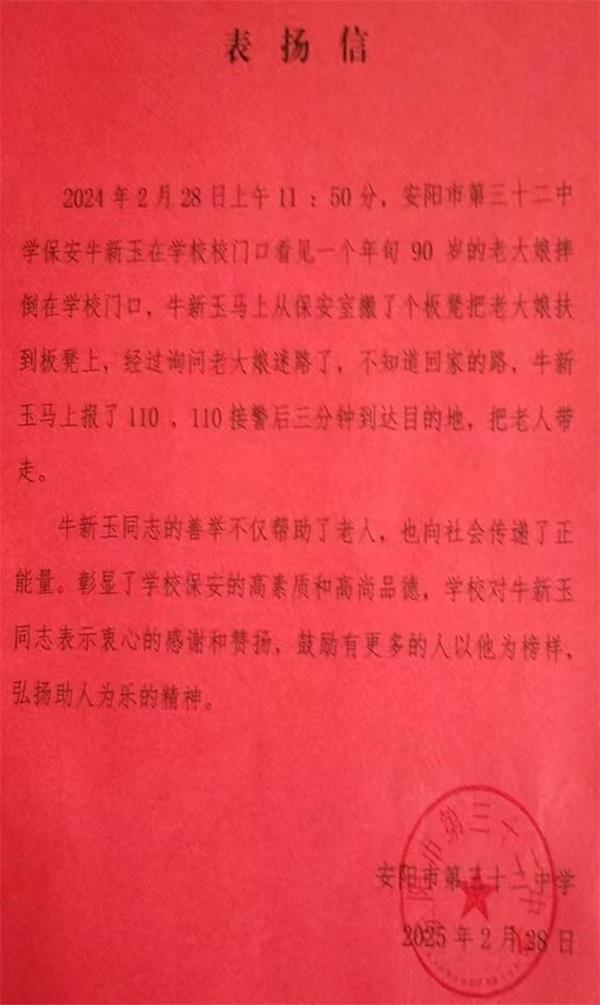 隊(duì)員牛新玉的善舉不僅幫助了老人,也向社會(huì)傳遞了正能量,彰顯了洹河保安的高素質(zhì)和高尚品德。學(xué)校特寫(xiě)出表?yè)P(yáng)信對(duì)牛新玉同志表示衷心的感謝和贊揚(yáng),鼓勵(lì)更多的人以他為榜樣,弘揚(yáng)助人為樂(lè)的精神。
